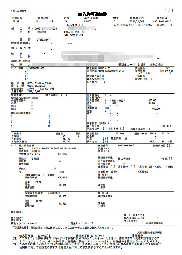 日本海關(guān)在進(jìn)口貨物通關(guān)后,會(huì)出一份輸入許可通知書文件,這份文件也是我們市場(chǎng)通常叫法稅金單。